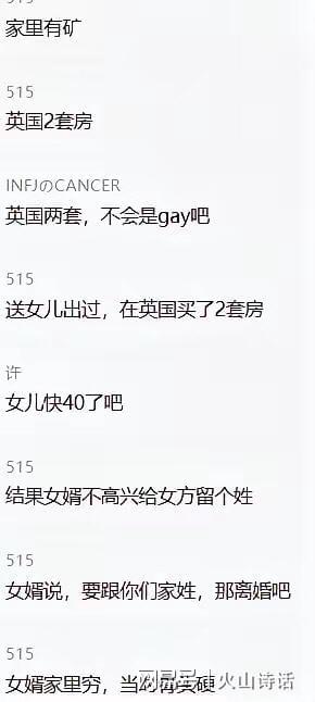 有网传的微信群说,女儿女婿都快40岁了,育有二孩,在英国两套房!女婿坚决反对第二个孩子随女方姓氏,说,要跟你们家姓,除非离婚!双方僵持不下。